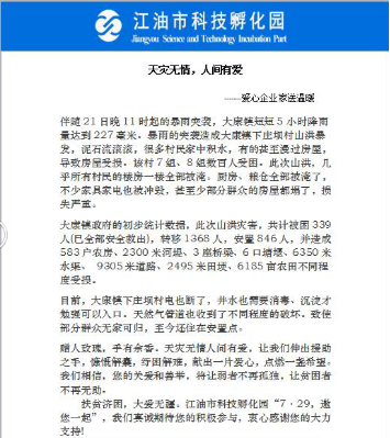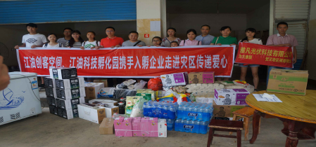 “7.21”的暴雨突襲,江油市大康鎮(zhèn)部分鄉(xiāng)村受洪澇之災(zāi)。部分村民的樓房被淹,不少家具家電被沖毀,甚至少部分群眾的房屋都塌了,損失嚴(yán)重。一方有難,八方支援,江油市科技孵化園在第一時(shí)間發(fā)起倡議書組織入孵企業(yè)“走進(jìn)災(zāi)區(qū),傳遞愛心”。