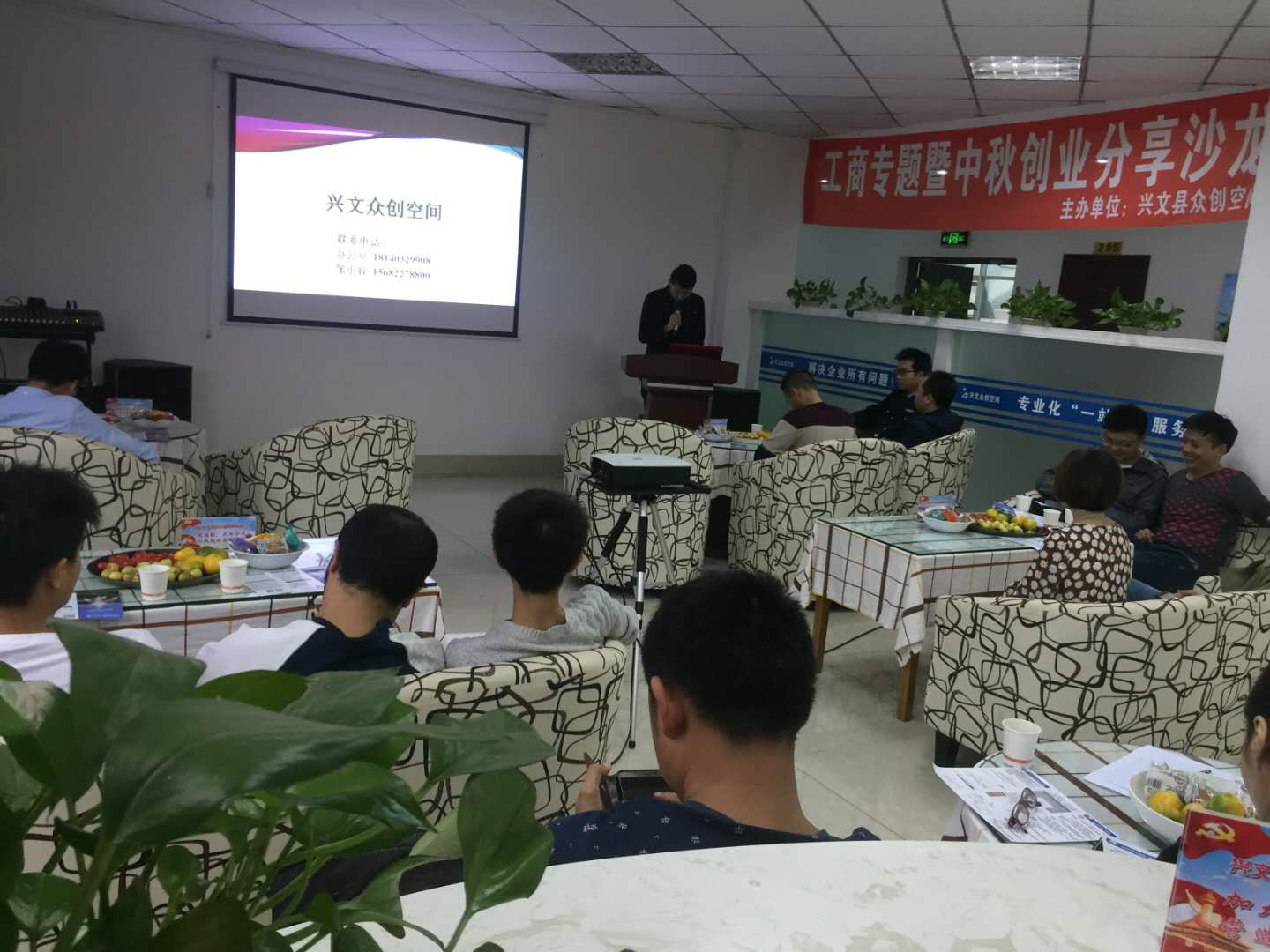 為了規(guī)范企業(yè)的經(jīng)營活動,避免企業(yè)因為對政策和制度的“不了解”、“不清楚”而受到處罰或者納入“黑名單”,同時為支持縣域開展以科技創(chuàng)新為核心的全面創(chuàng)新,進一步推動大眾創(chuàng)業(yè)、萬眾創(chuàng)新。2018年9月20日下午,興文眾創(chuàng)空間舉辦了“工商專題暨中秋創(chuàng)業(yè)分享沙龍”的活動,本次活動由眾創(chuàng)空間副經(jīng)理王金志主持,參會領導:興文工業(yè)園區(qū)辦公室主任王春、縣工商局劉軍。參會代表:興文眾創(chuàng)空間企業(yè)代表,籌劃創(chuàng)業(yè)的代表等二十余人。