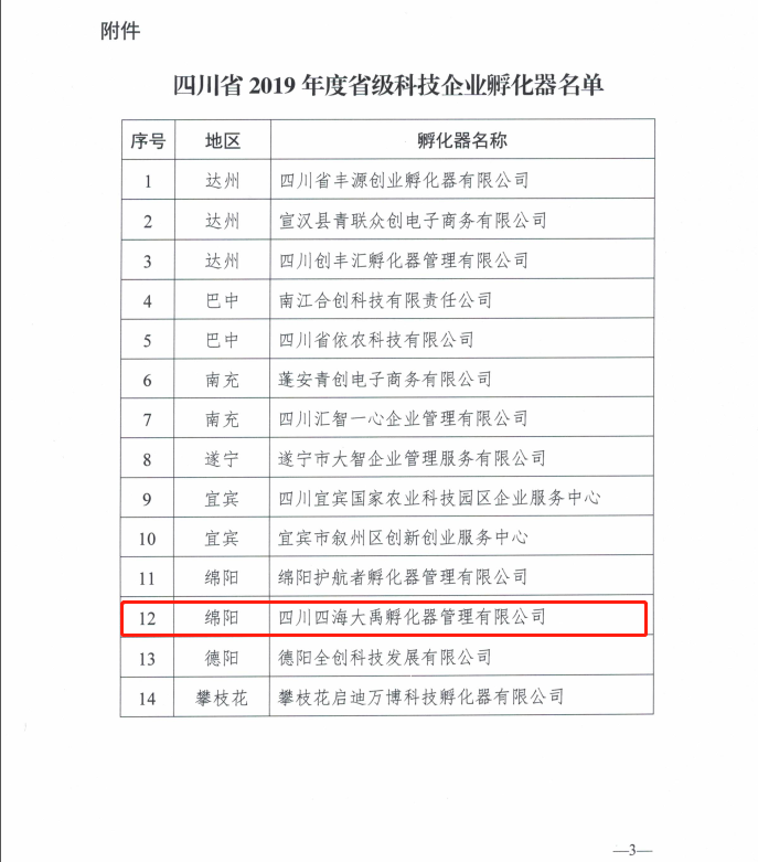 12月31日,四川省科技廳公布了2019年度省級科技孵化器認定備案名單,全省14家孵化器入選。我四川四海大禹孵化器管理有限公司運營的梓潼科技孵化中心成功通過備案,這是我科源科技下屬孵化器中第三個被成功認定為省級科技企業(yè)孵化器,取得的又一次重大突破! 上一篇:科源集團廖藝徽董事長一行到鹽亭調(diào)研創(chuàng)業(yè)孵化中心在孵企業(yè) ????下一篇:喜訊??!2019年興文眾創(chuàng)空間成功備案省級眾創(chuàng)空間